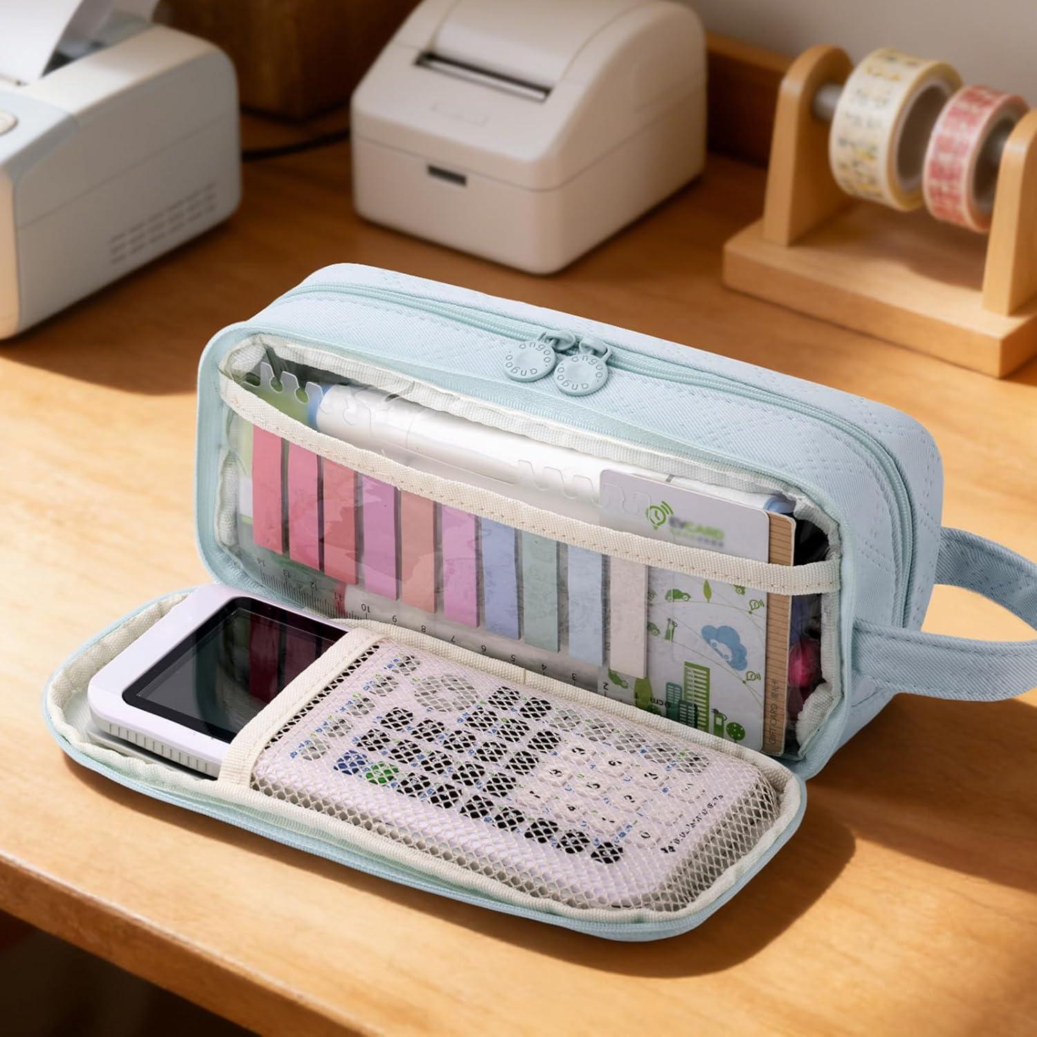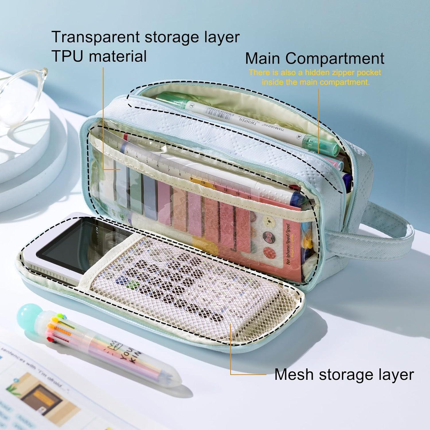 【Dual-Layer Transparent Compartment + Handle Design】The dual-layer transparent compartment design not only allows for easy decoration of your pencil case but also provides better visibility of the stationery stored inside the main pocket. The external handle design makes the pencil case more portable.